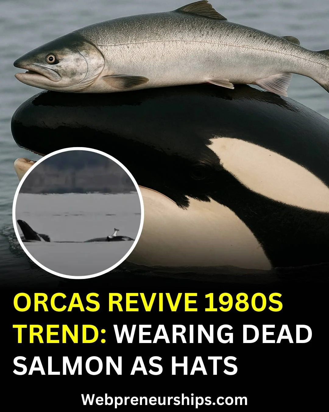 *Whaaat? In the waters near Washington state, Orcas have been filmed wearing dead salmon as hats! Scientists have determined this to be a form of play for the Orcas [Webpreneurships 5/8/2025]. Like human beings, the Orcas play games, have trends (as in the hats), and have customs. Take a look!